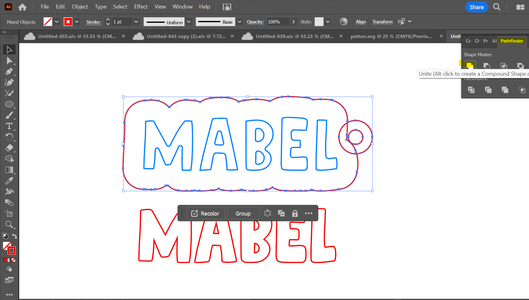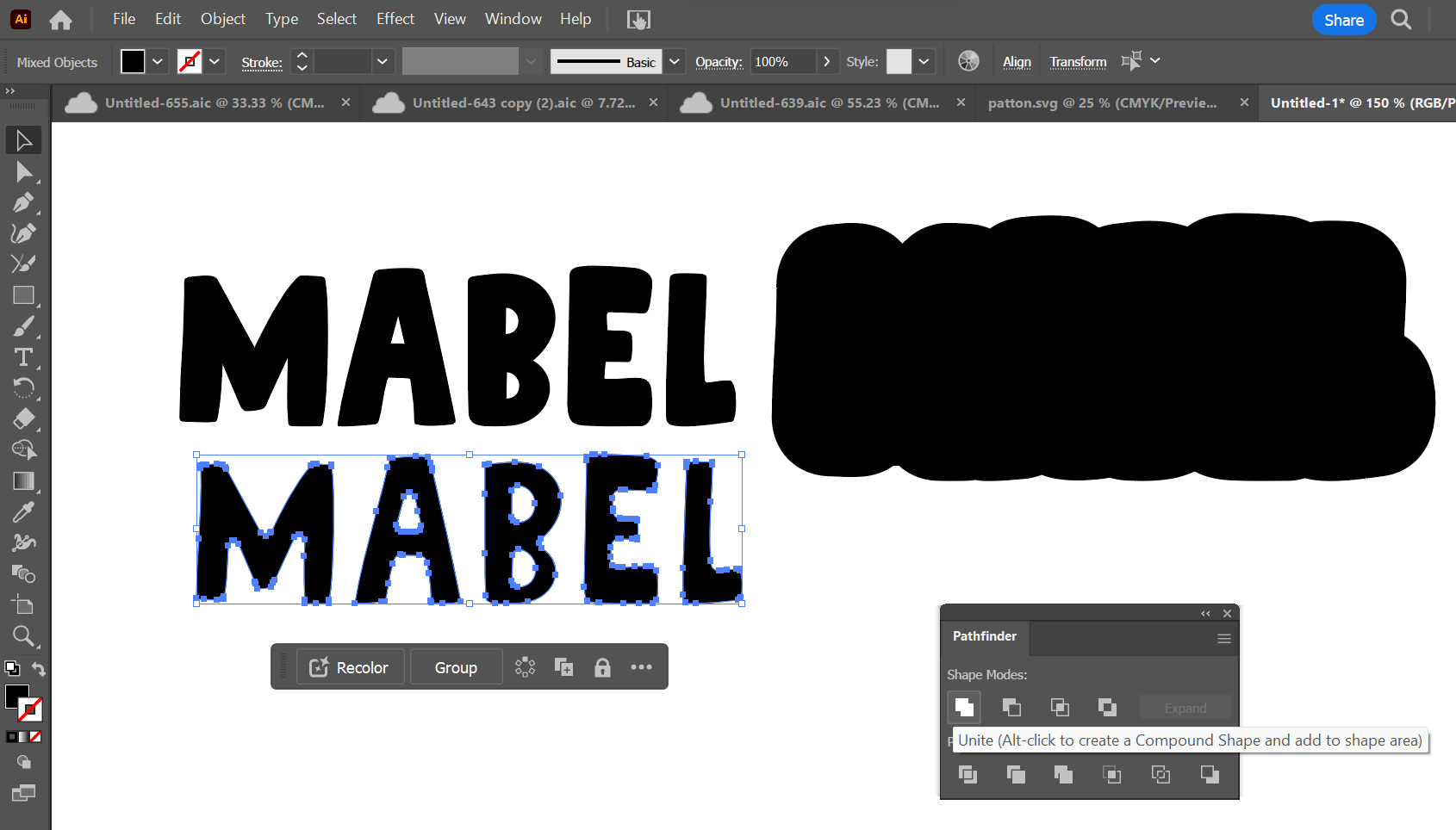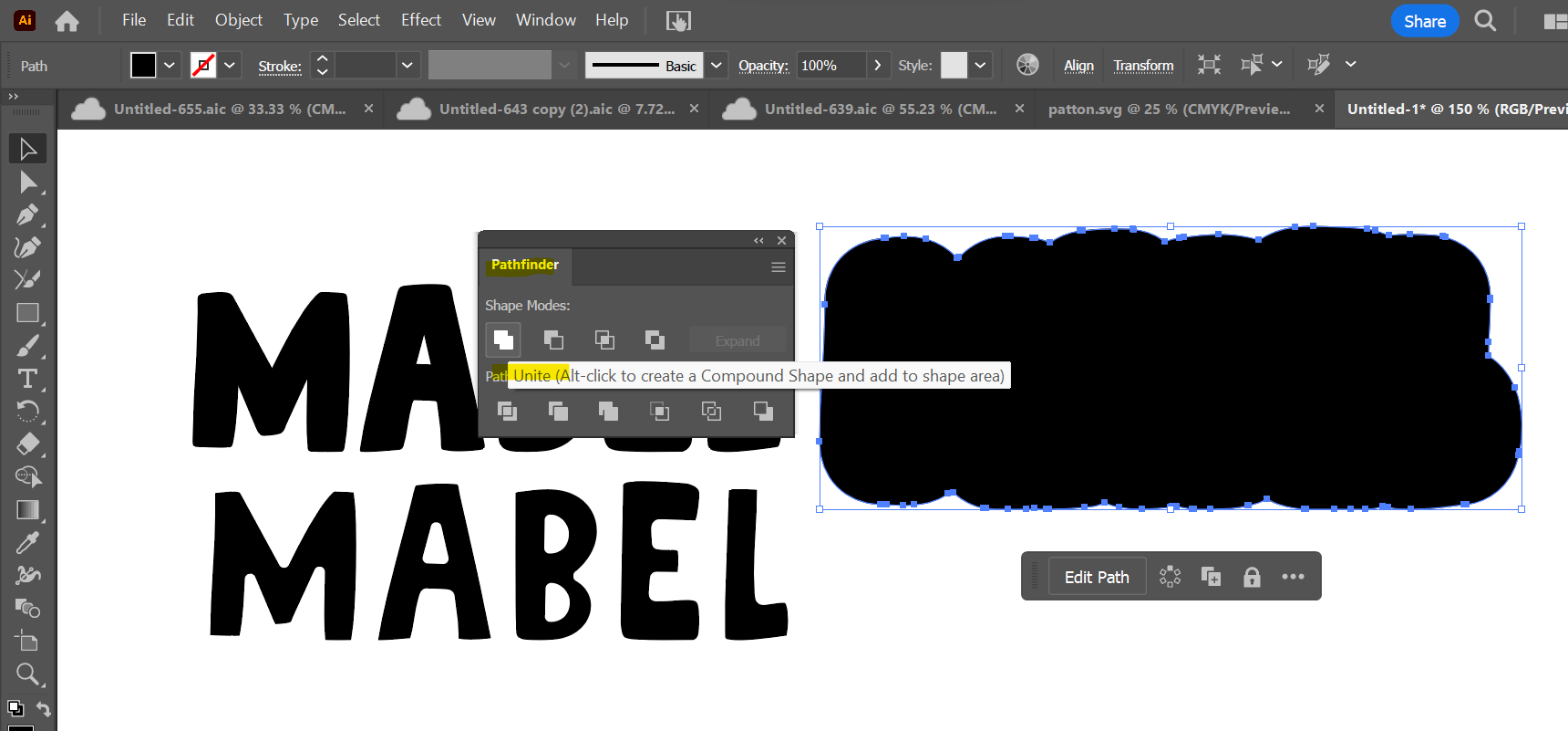 Highlight each set of letters (your original version of the text and the inset text) separately and unite those as well. This step is especially important if using a script font or a font where your letters overlap. If you do not unite them, they will cut out individually instead of as one solid piece!