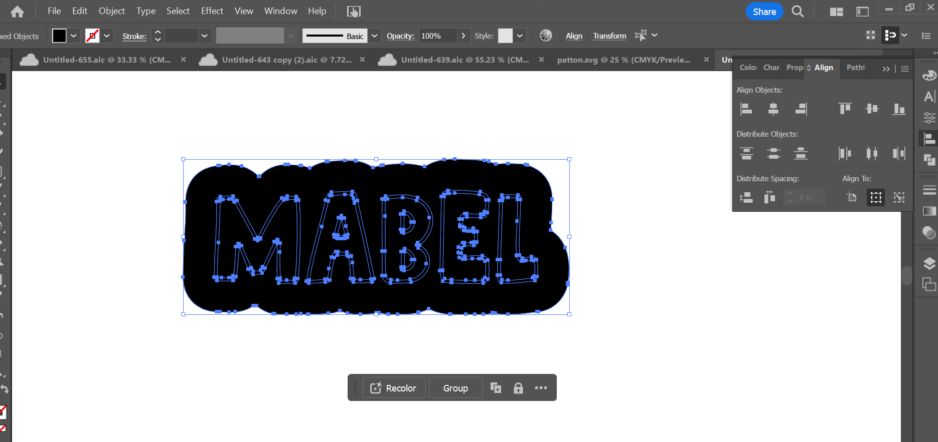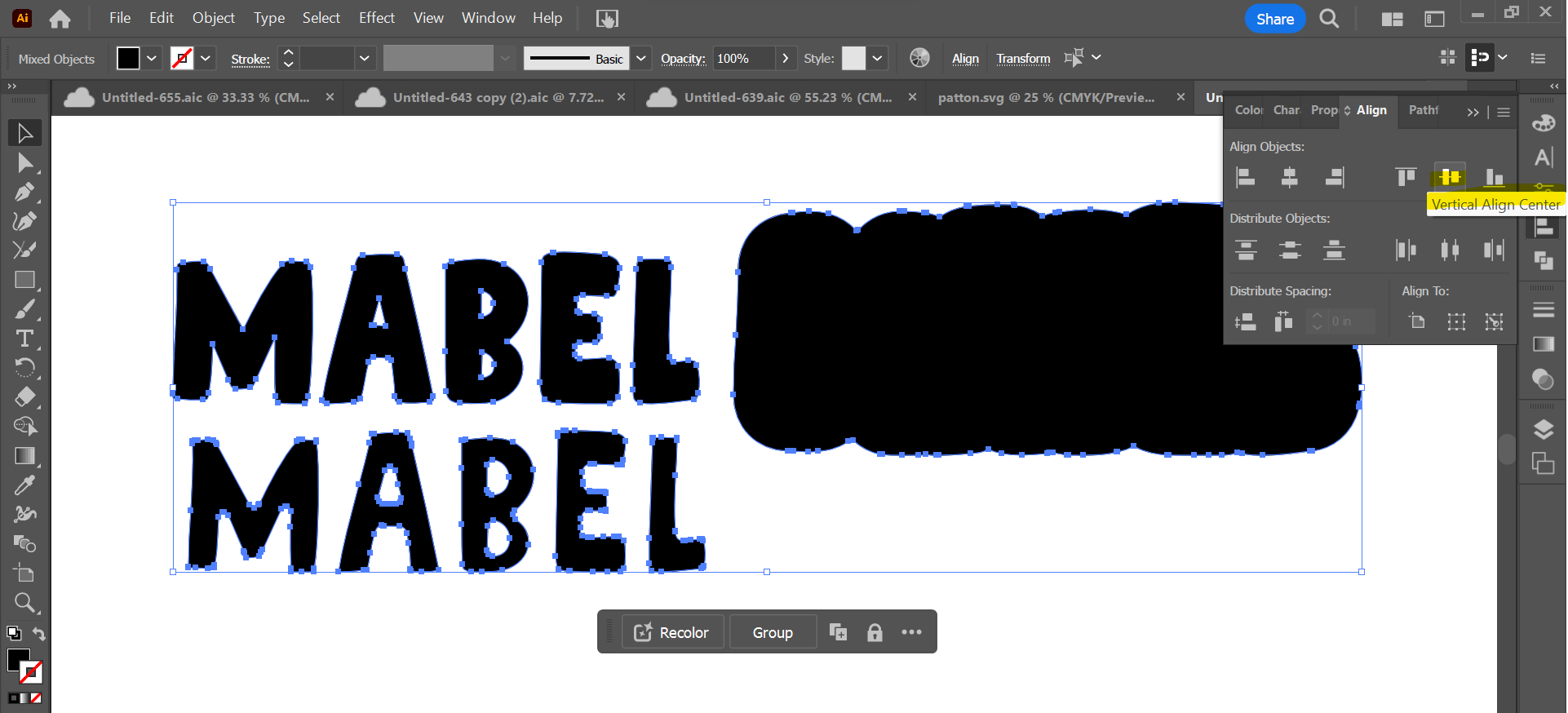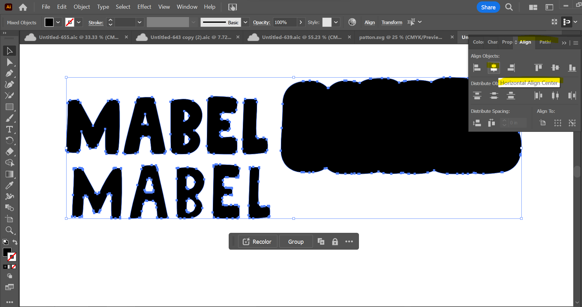 Once each set has been united (you may also hear it described as "welded"), select all 3 and use the "Align" function to align vertically and horizontally by center. To open the "Align" window, do "Window" and select "Align," or use keyboard shortcut SHIFT + F7. (Note that we're including the layered text when aligning these to be sure that it will cover the inset scoring lines once layered, even though it won't remain in this position on your final SVG file.)