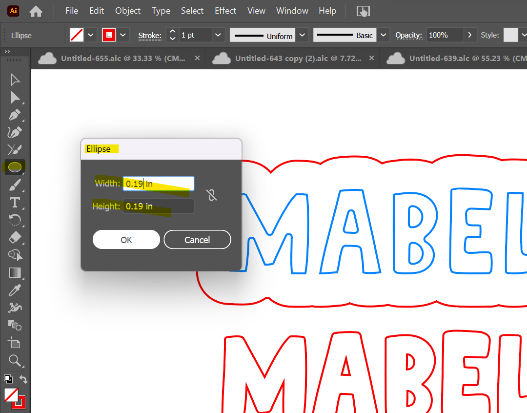 Click on your screen. A window will pop up prompting you to input dimensions. Enter "0.19 inches" for each and click "OK."