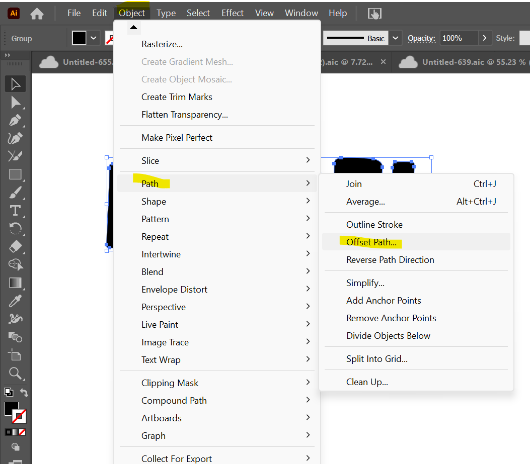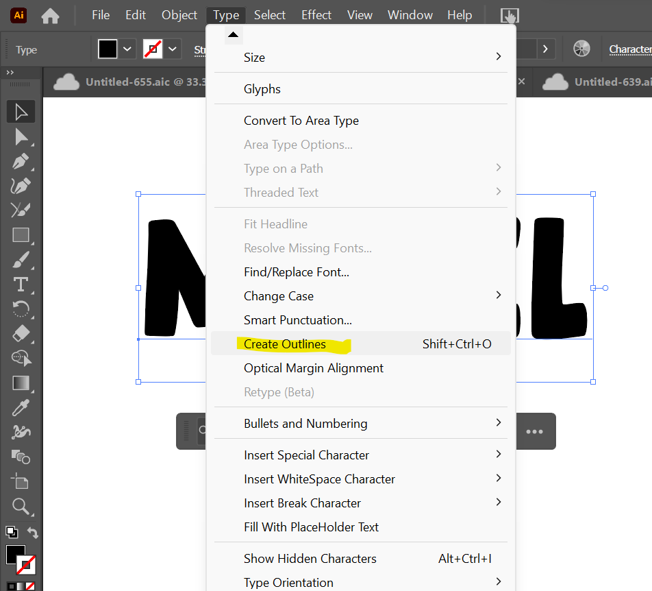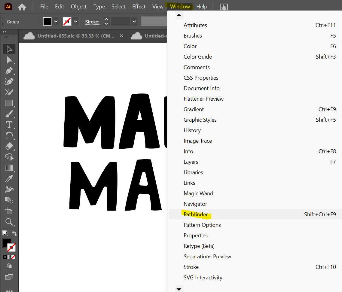 Select the entire word including the offset, then open your "Pathfinder" window. You can find the "Pathfinder" window by doing "Window," select "Pathfinder" or by doing SHIFT + CTRL + F9 (Windows) or SHIFT + CMD + F9 (Mac).